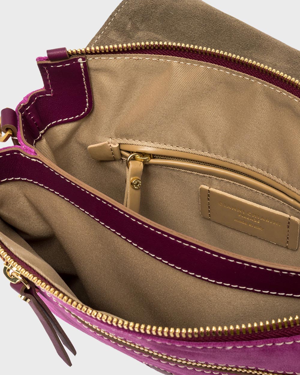 Drei werden eins. Die Three in Desert Flower ist Gianni Chiarinis verspielte Antwort auf Funktionalität – drei Bags, die oben in einem Kontrast-Zip-Detail konvergieren. Gehämmertes Leder in warmem Desert Flower-Pink mit dünnem Lederriemen für Schulter oder Hand. Jung, frisch, überraschend vielseitig. Von Florenz designed für Frauen, die Regeln brechen, nicht befolgen. Mono-Looks? Brauchen diese Tasche als Pop.